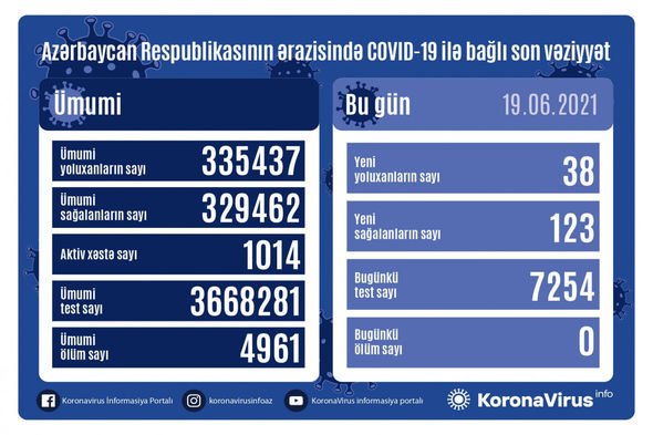 Son sutka ərzində yeni yoluxma hallarının müəyyənləşdirilməsi ilə əlaqədar 7 254, bu günə qədər isə ümumilikdə 3 668 281 test icra olunub.
