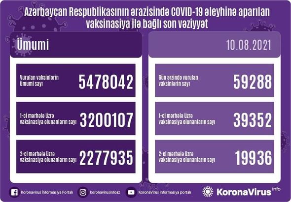 Ölkədə vurulan vaksinlərin ümumi sayı 5 478 042, birinci mərhələ üzrə vaksinasiya olunanların ümumi sayı 3 200 107, ikinci mərhələ üzrə vaksinasiya olunanların sayı isə 2 277 935 təşkil edir.