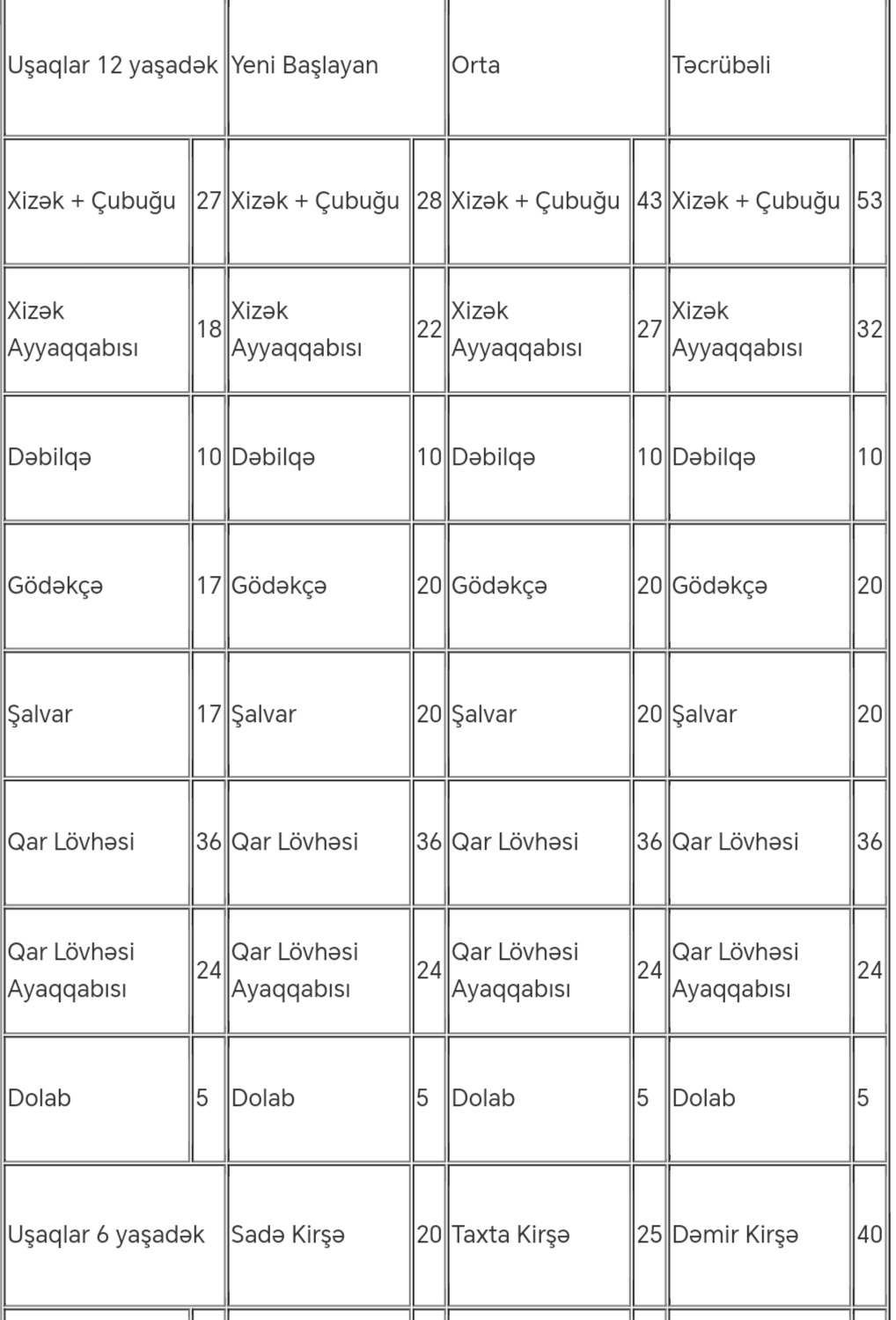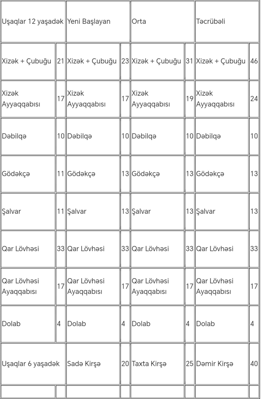 Xizək turu üçün avadanlıqların icarə qiymətləri: