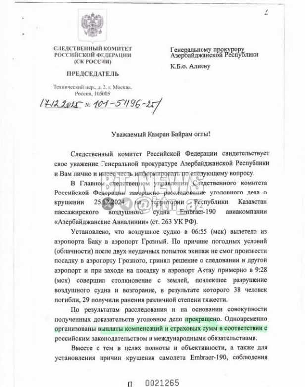 "2025-ci ilin dekabrında Qazaxıstanın Aktau şəhərinin yaxınlığında qəzaya uğrayan AZAL təyyarəsi əlverişsiz hava şəraiti səbəbindən Rusiya ərazisində eniş edə bilməyib. Bu əsasla da Rusiya Federasiyasının İstintaq Komitəsi cinayət işinə xitam vermək qərarına gəlib".