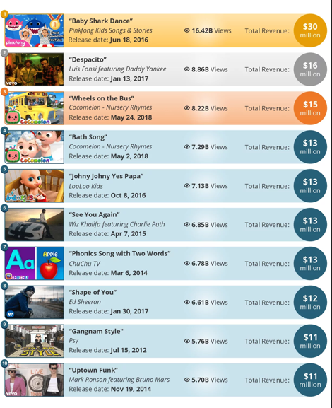 Bu video son 5 ildə YouTube-da birinci yerdə qərarlaşıb. Rəsmi "Ginnesin Rekordlar Kitabı"na düşmüş uşaq mahnısı sadə sözləri, şən ritmi və yadda qalan rəqsi ilə uşaqların təkrar-təkrar baxmasına səbəb olur.
