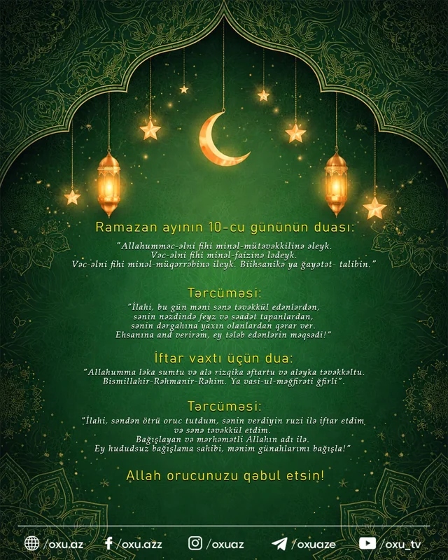 "İlahi, səndən ötrü oruc tutdum, sənin verdiyin ruzi ilə iftar açdım və sənə təvəkkül etdim. Bağışlayan və mehriban Allahın adı ilə. Ey hüdudsuz bağışlama sahibi, mənim günahlarımı bağışla!"
