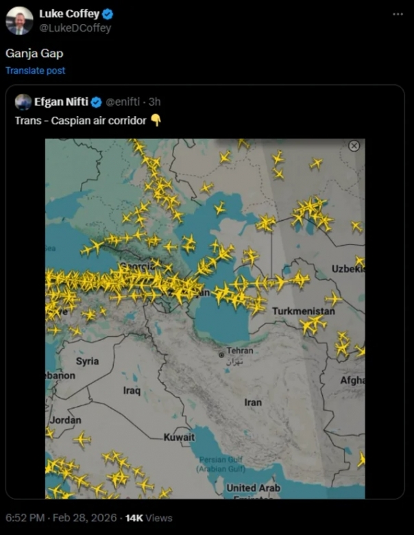"İran müharibə vəziyyətində olduğu və regionda hava məkanı bağlandığı üçün qlobal reyslər marşrutlarını dəyişərək Azərbaycan üzərindən keçir. Azərbaycan kiçik ölkə deyil - Avrasiyanın strateji körpüsüdür", - "Daily Turkic"in "X" sosial şəbəkə hesabında qeyd olunub.