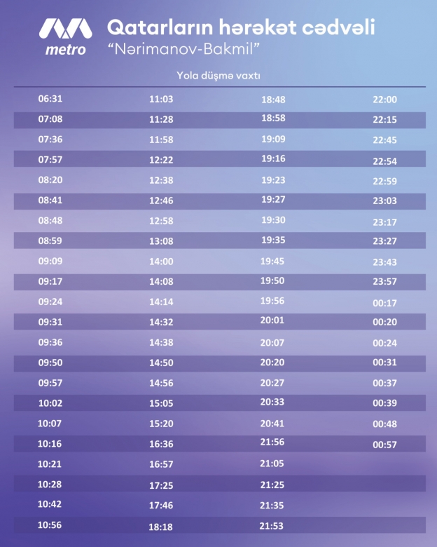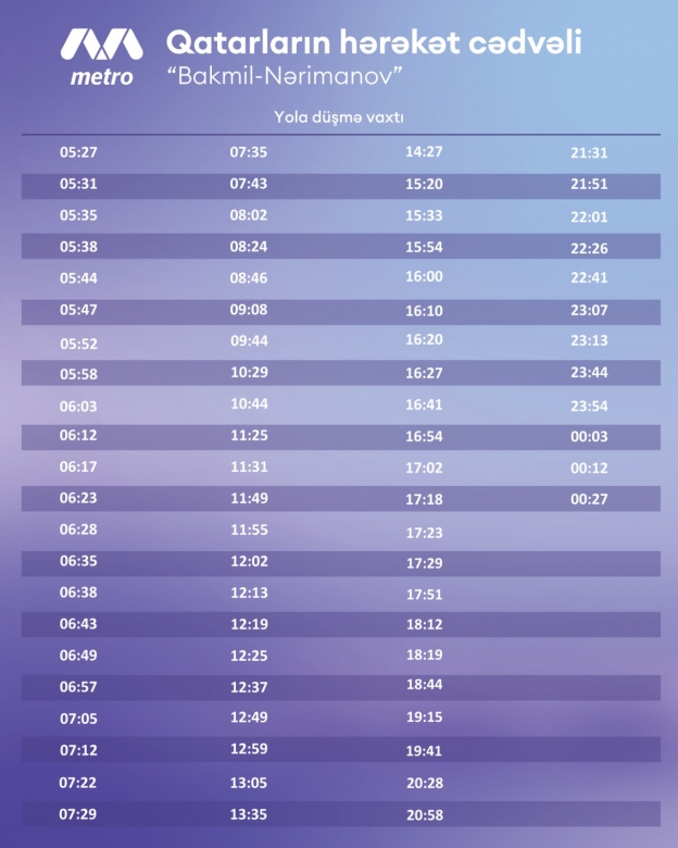 “Bakı metropoliteninin Yaşıl və Qırmızı xətlərində sərnişinlərə xidmət keyfiyyətinin yüksəldilməsi ilə bağlı yeni hərəkət qrafikinin sınaqlarına başlanılır. Burada əsas məqsədlərdən biri günorta saatlarında sərnişin axınının tələbata uyğun tənzimlənməsidir. Sınaqların gedişi və qeyd olunan istiqamətdə qatarların hərəkət cədvəli ilə bağlı ictimaiyyətə əlavə məlumat veriləcək”, - deyə əlavə edilib.