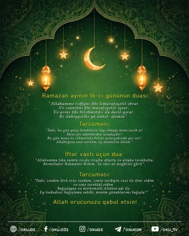 Ramazan ayının on altıncı gününün imsak, iftar və namaz vaxtları