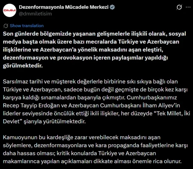 Türkiyənin Prezident Administrasiyasının Kommunikasiya İdarəsinin Dezinformasiya ilə Mübarizə Mərkəzi (DMM) Türkiyə-Azərbaycan münasibətləri ilə bağlı yayılan bəzi məlumatların dezinformasiya xarakteri daşıya biləcəyi barədə xəbərdarlıq edib.