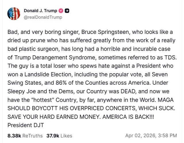 Donald Tramp B.Sprinqstinin yaradıcılığına və xarici görünüşünə də toxunub. O, musiqiçini "pis və çox darıxdırıcı müğənni" kimi adam xarakterizə edib.