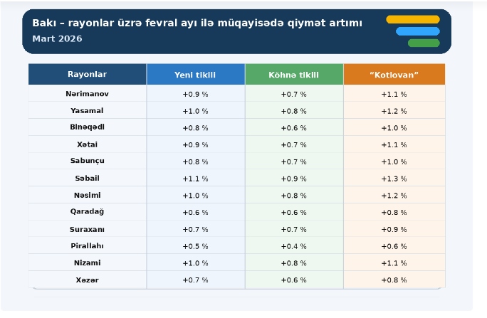 Rayonlar üzrə isə, Səbail, Yasamal və Nəsimi rayonları ən yüksək artım tempinə malik mərkəzi bazar zonaları olub. Nərimanov və Xətai, Nizami, Binəqədi sabit və yüksək likvidliyə malik orta seqment bazarı hesab olunur. Suraxanı, Sabunçu, Qaradağ, Pirallahı və qismən Xəzər rayonları inkişaf edən, lakin qiymət artım tempinin daha aşağı olduğu periferik bazarlar kimi qeydə alınıb.