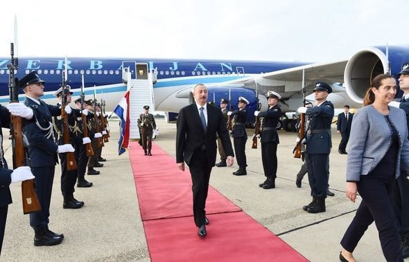 В аэропорту «Франьо Туджман» города Загреб, где развевались государственные флаги двух стран, в честь президента Ильхама Алиева был выстроен почетный караул.