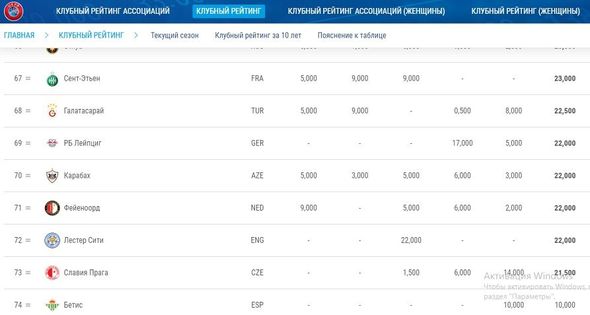Клуб «Карабах» обойдя такие клубы, как «Милан», «Лестер», «Фейенорд» и «Сельта» обосновался на 70-м месте.