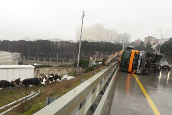 В Баку перевернулся грузовик с коровами – ФОТО