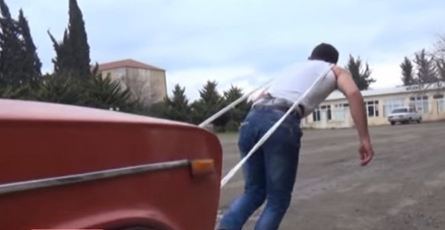В Билясуваре местный силач взялся зубами протащить автомобиль - ВИДЕО